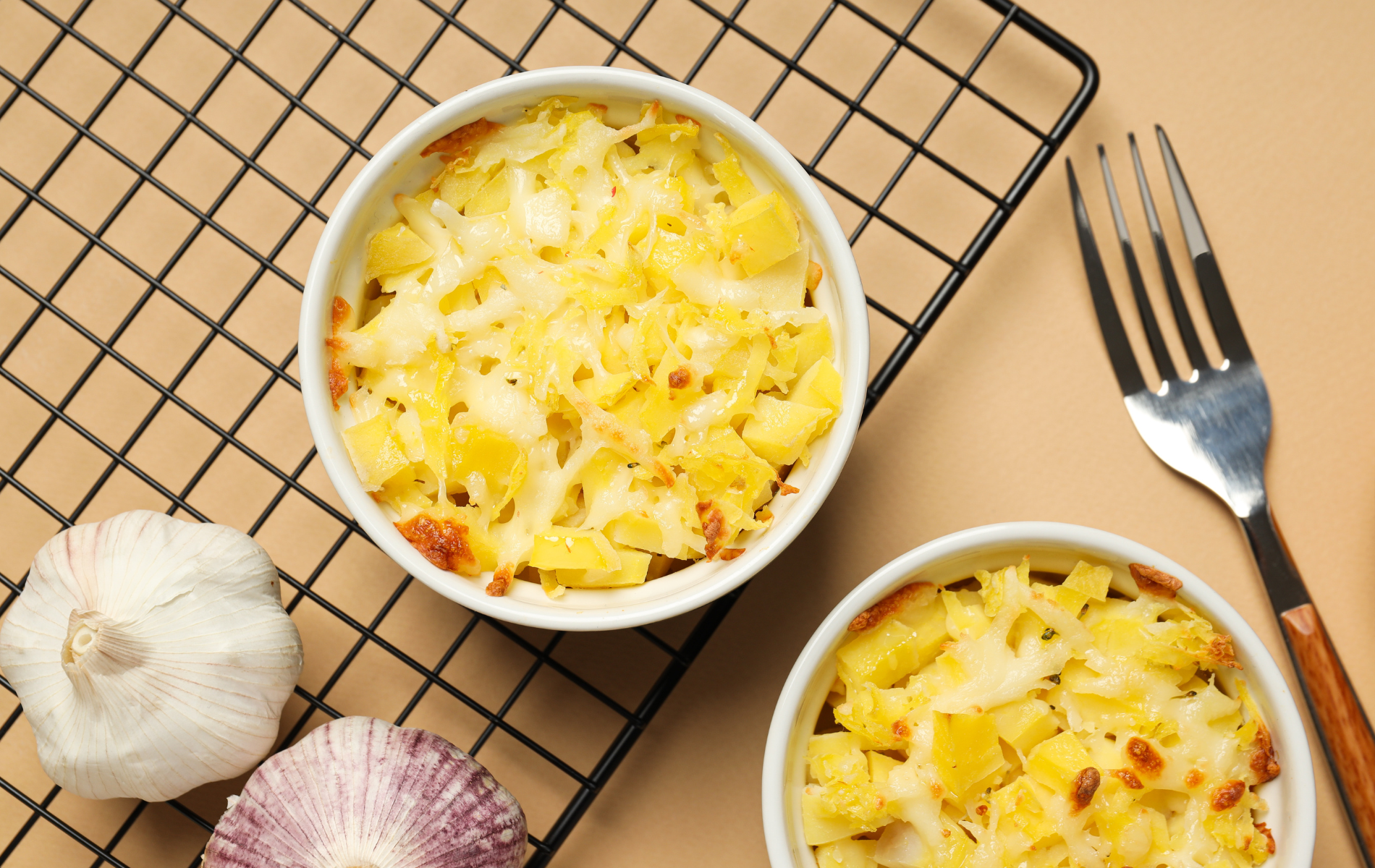 plastry ziemniaków, bekon, cebula, papryka peperoni w sosie śmietankowym -